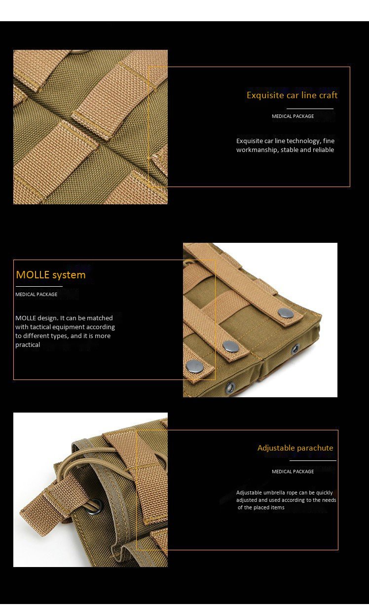 Molle webbing on the front allows you to expand carrying capacity. Molle straps on the back can simply be attached to your tactical belt, military vests, backpack, radio pouch, rifle case, magazine holster,molle mag pouch etc.